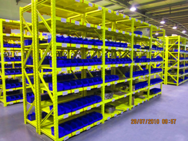 采用柱片與橫梁掛接的結(jié)構(gòu),易為插接組合式,橫梁以50mm節(jié)距調(diào)節(jié)層高,適合于承載大且橫梁較長的情況下,通常每層載重量在350-800kg時使用較合適。層面可鋪鋼板、亦可鋪木板(原木木板、中纖板、帖塑刨花板等)。
